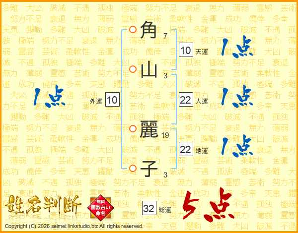 生活面を象徴する運勢です。外部から受ける影響力を表し、結婚運、家庭運や職場、環境への順応性を表します。総運から人運を引いた画数。姓や名が1文字の場合を除く。