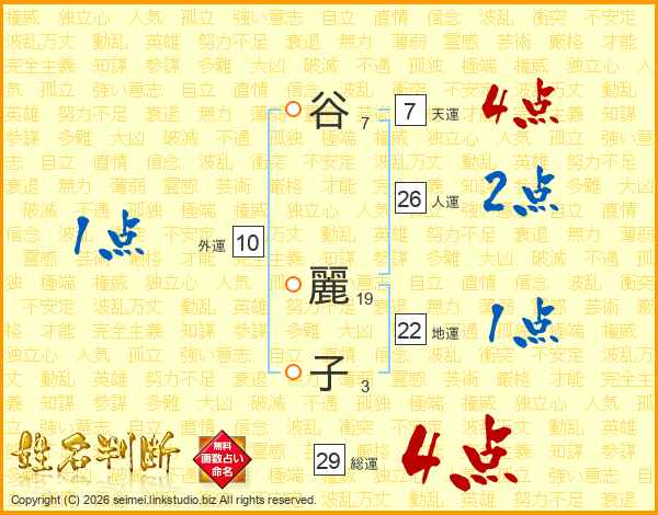 谷(7画) 麗(19画)子(3画)