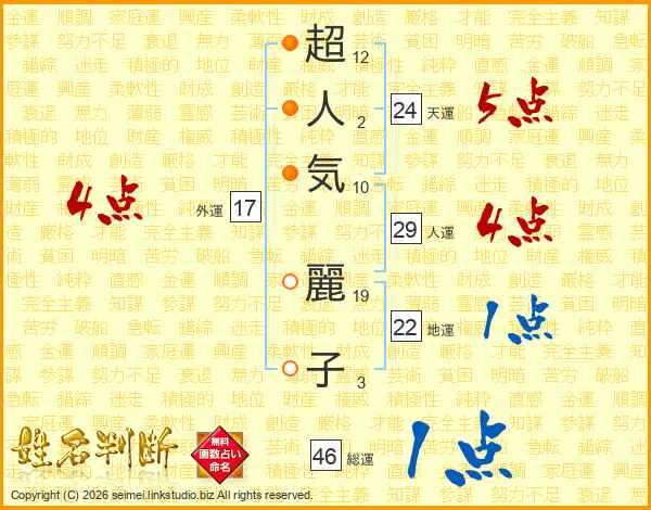 超(12画)人(2画)気(10画) 麗(19画)子(3画)