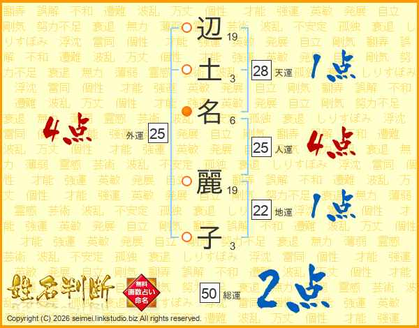 辺(19画)土(3画)名(6画) 麗(19画)子(3画)