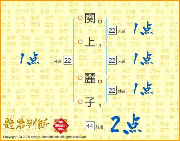 生活面を象徴する運勢です。外部から受ける影響力を表し、結婚運、家庭運や職場、環境への順応性を表します。総運から人運を引いた画数。姓や名が1文字の場合を除く。
