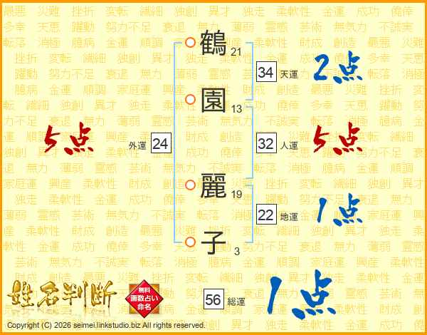 鶴(21画)園(13画) 麗(19画)子(3画)