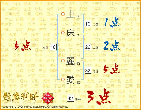生活面を象徴する運勢です。外部から受ける影響力を表し、結婚運、家庭運や職場、環境への順応性を表します。総運から人運を引いた画数。姓や名が1文字の場合を除く。