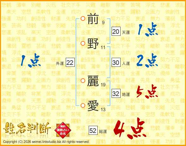 生活面を象徴する運勢です。外部から受ける影響力を表し、結婚運、家庭運や職場、環境への順応性を表します。総運から人運を引いた画数。姓や名が1文字の場合を除く。