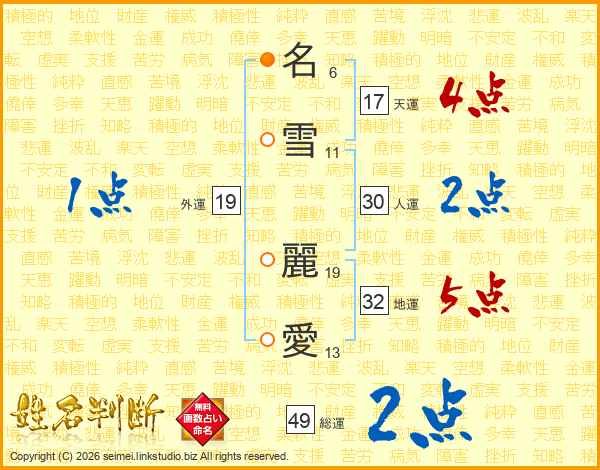 名(6画)雪(11画) 麗(19画)愛(13画)
