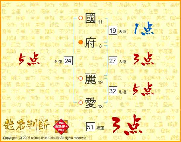生活面を象徴する運勢です。外部から受ける影響力を表し、結婚運、家庭運や職場、環境への順応性を表します。総運から人運を引いた画数。姓や名が1文字の場合を除く。