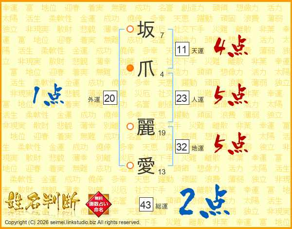 坂爪麗愛さんの天運は11画の4点!