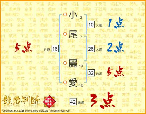 小(3画)尾(7画) 麗(19画)愛(13画)