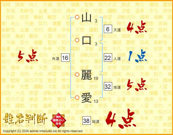 山口麗愛さんの総運は38画の4点!