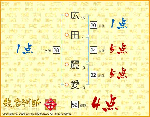 広田麗愛さんの総運は52画の4点!