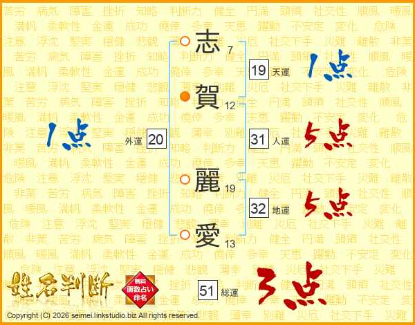 志(7画)賀(12画) 麗(19画)愛(13画)