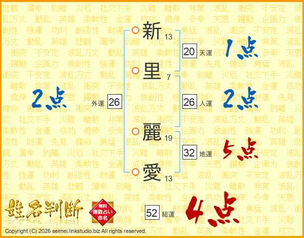 生活面を象徴する運勢です。外部から受ける影響力を表し、結婚運、家庭運や職場、環境への順応性を表します。総運から人運を引いた画数。姓や名が1文字の場合を除く。