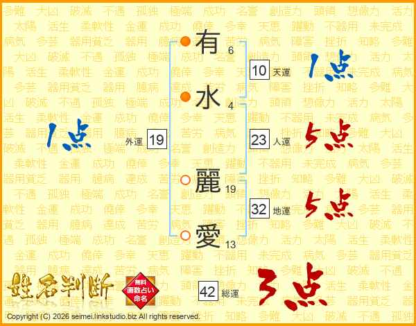 生活面を象徴する運勢です。外部から受ける影響力を表し、結婚運、家庭運や職場、環境への順応性を表します。総運から人運を引いた画数。姓や名が1文字の場合を除く。