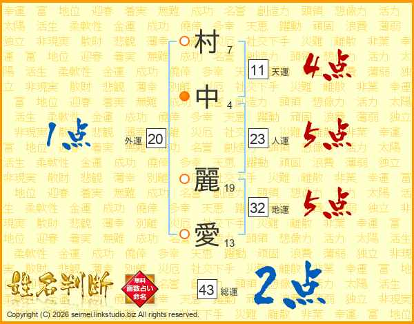村中麗愛さんの地運は32画の5点!