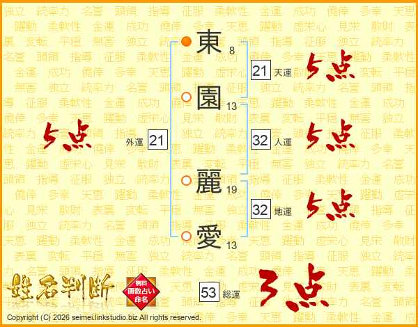 生活面を象徴する運勢です。外部から受ける影響力を表し、結婚運、家庭運や職場、環境への順応性を表します。総運から人運を引いた画数。姓や名が1文字の場合を除く。