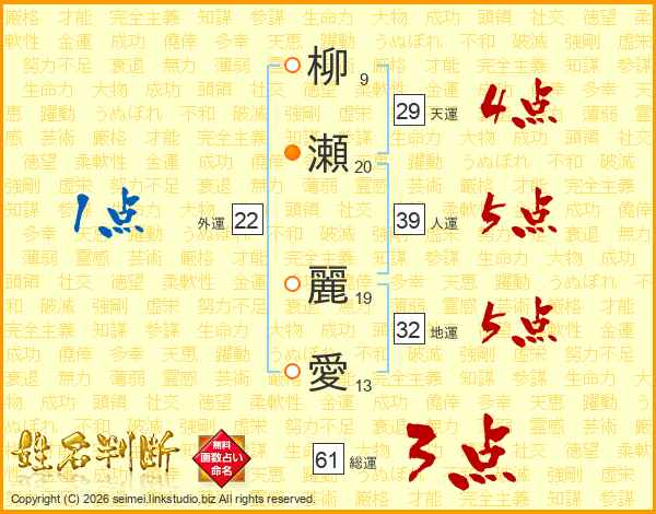 柳(9画)瀬(20画) 麗(19画)愛(13画)