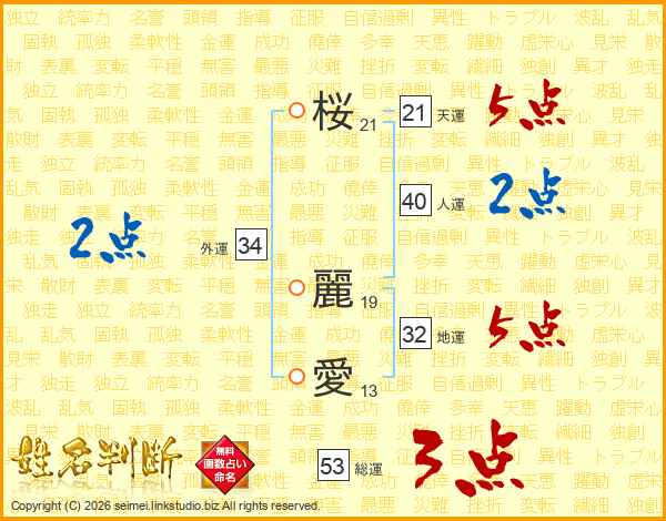 桜(21画) 麗(19画)愛(13画)