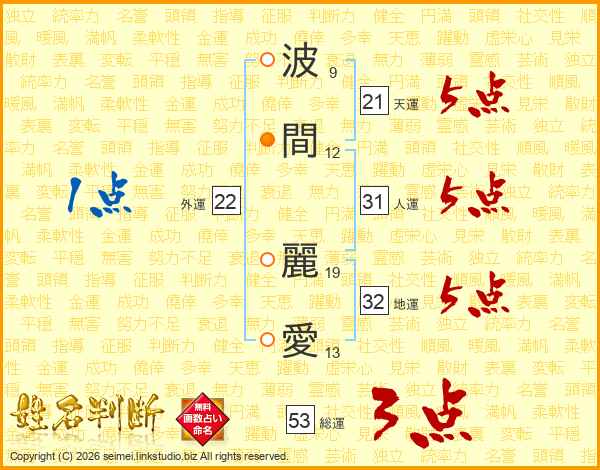 波(9画)間(12画) 麗(19画)愛(13画)
