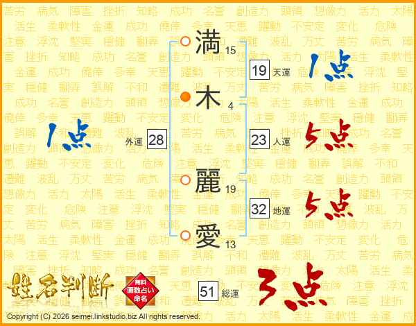 満(15画)木(4画) 麗(19画)愛(13画)