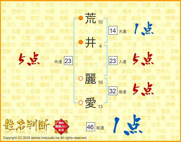 荒(10画)井(4画) 麗(19画)愛(13画)