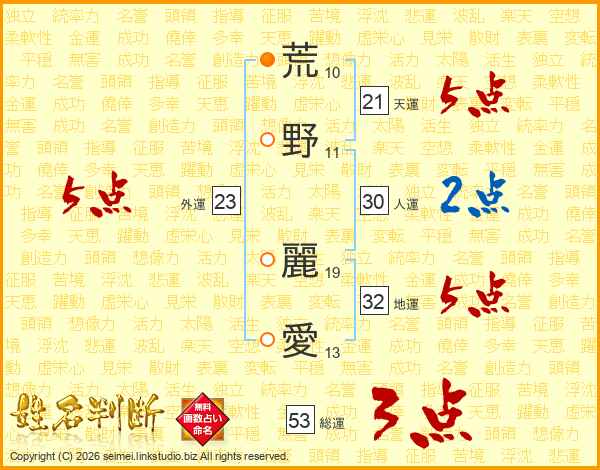 荒(10画)野(11画) 麗(19画)愛(13画)