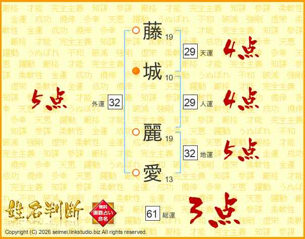 藤(19画)城(10画) 麗(19画)愛(13画)