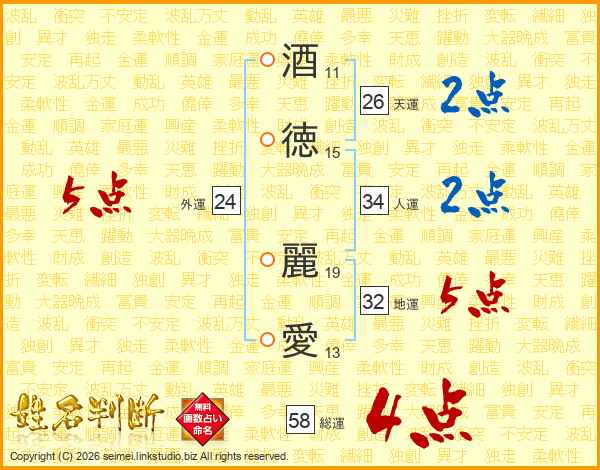酒徳麗愛さんの総運は58画の4点!