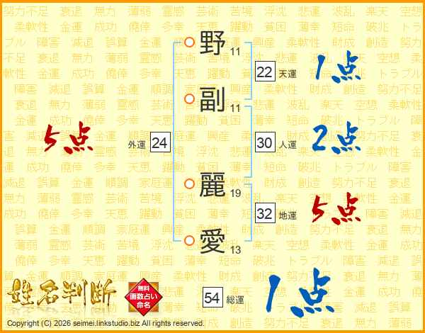 生活面を象徴する運勢です。外部から受ける影響力を表し、結婚運、家庭運や職場、環境への順応性を表します。総運から人運を引いた画数。姓や名が1文字の場合を除く。