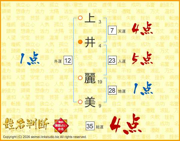 上(3画)井(4画) 麗(19画)美(9画)