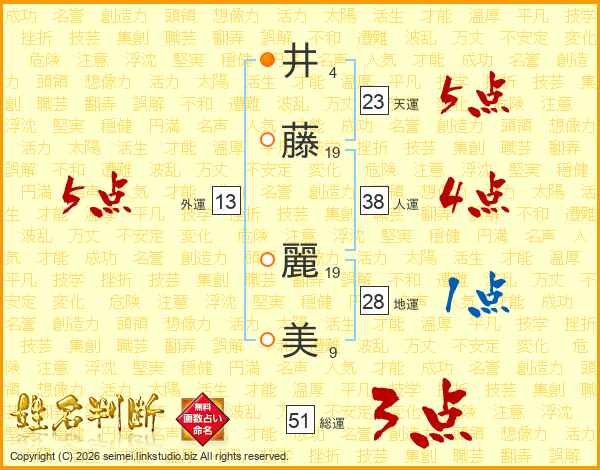 生活面を象徴する運勢です。外部から受ける影響力を表し、結婚運、家庭運や職場、環境への順応性を表します。総運から人運を引いた画数。姓や名が1文字の場合を除く。