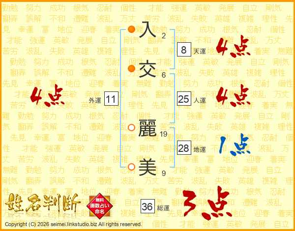 生活面を象徴する運勢です。外部から受ける影響力を表し、結婚運、家庭運や職場、環境への順応性を表します。総運から人運を引いた画数。姓や名が1文字の場合を除く。