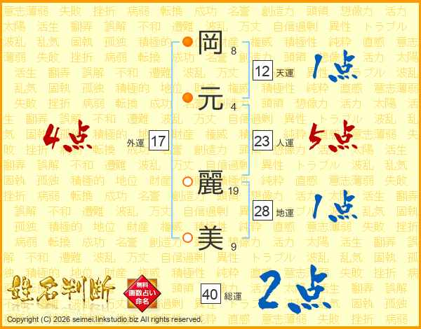 生活面を象徴する運勢です。外部から受ける影響力を表し、結婚運、家庭運や職場、環境への順応性を表します。総運から人運を引いた画数。姓や名が1文字の場合を除く。