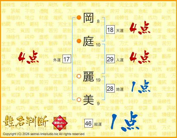 岡(8画)庭(10画) 麗(19画)美(9画)