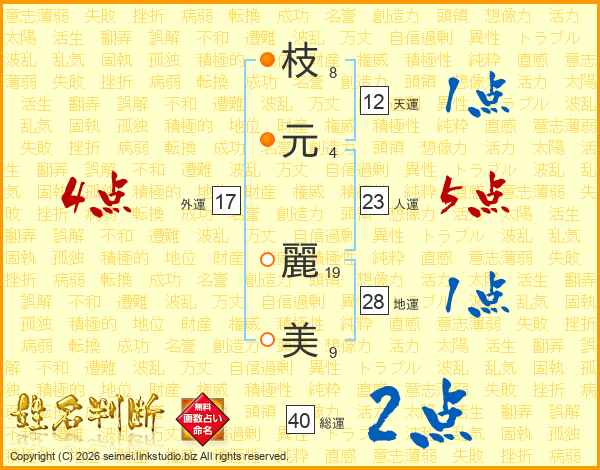 枝(8画)元(4画) 麗(19画)美(9画)