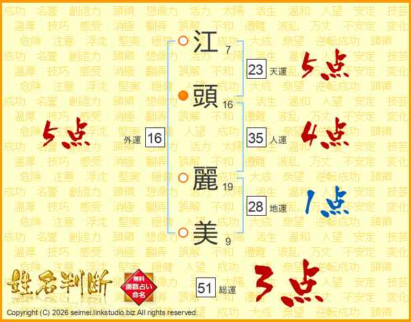 江(7画)頭(16画) 麗(19画)美(9画)