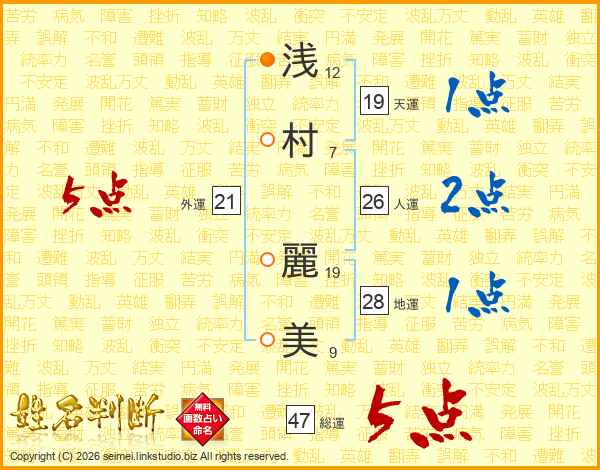 浅(12画)村(7画) 麗(19画)美(9画)