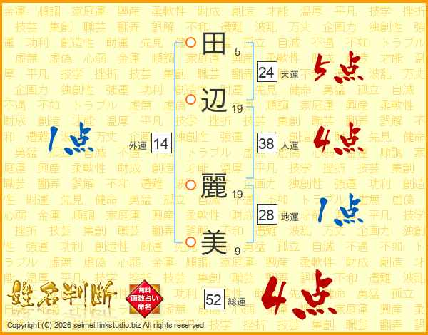 田(5画)辺(19画) 麗(19画)美(9画)