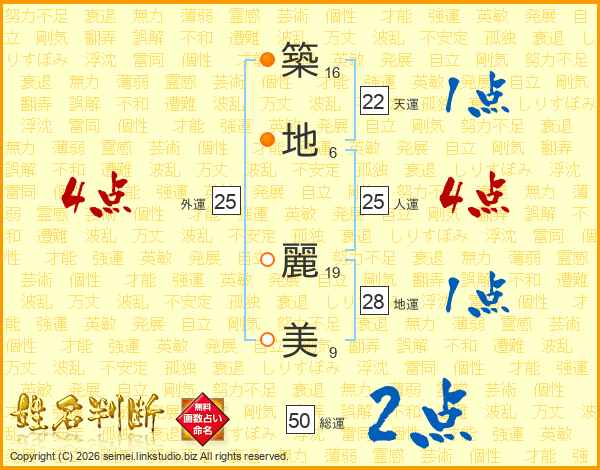 築(16画)地(6画) 麗(19画)美(9画)