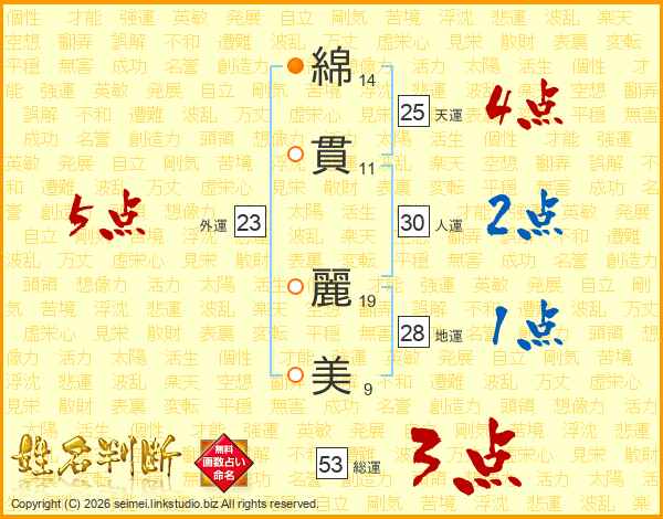 綿(14画)貫(11画) 麗(19画)美(9画)