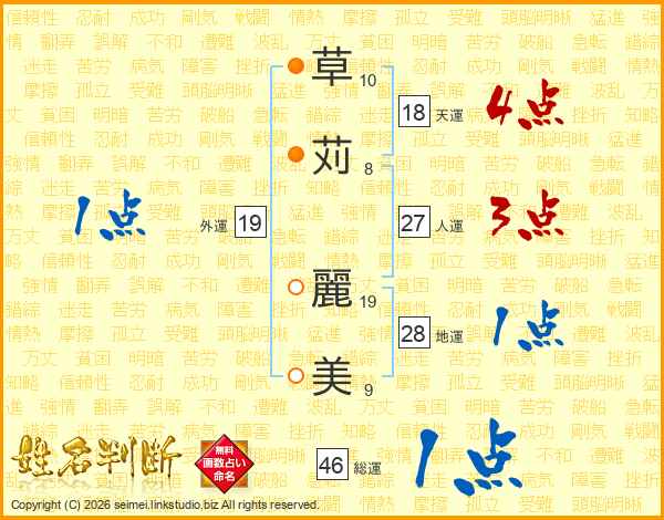 草(10画)苅(8画) 麗(19画)美(9画)