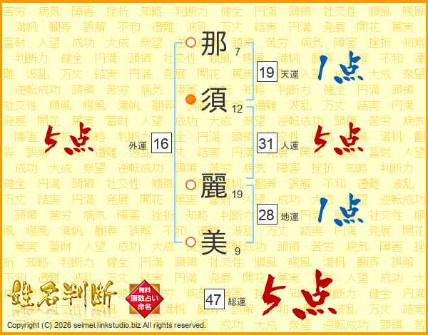 那(7画)須(12画) 麗(19画)美(9画)