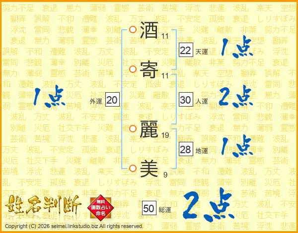 酒(11画)寄(11画) 麗(19画)美(9画)