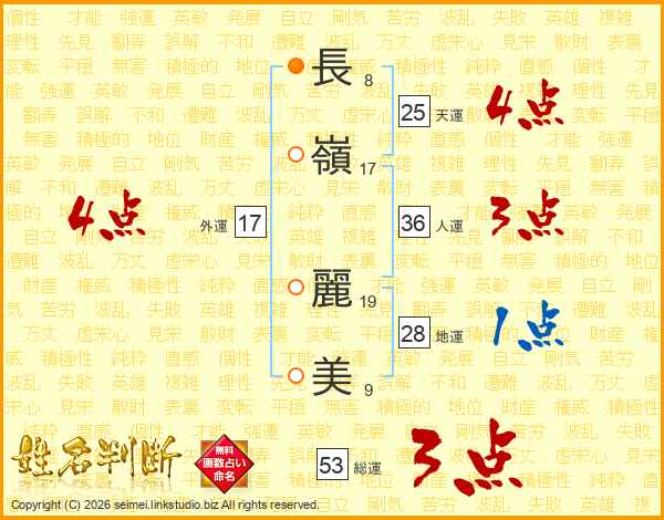 長(8画)嶺(17画) 麗(19画)美(9画)