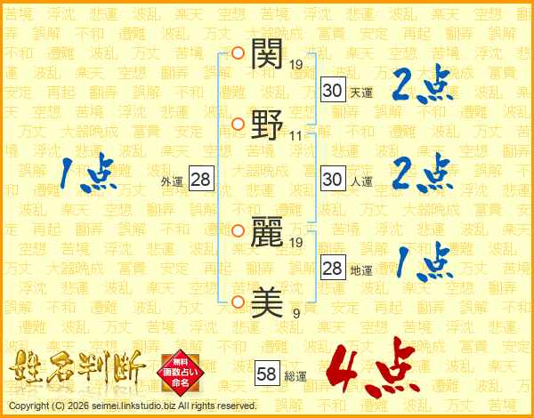 関野麗美さんの総運は58画の4点!