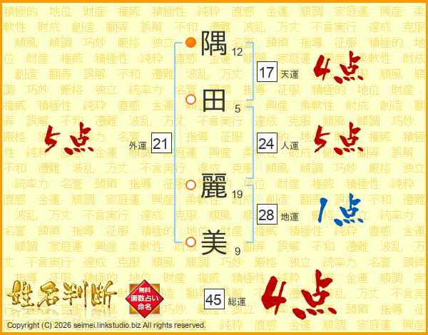 生活面を象徴する運勢です。外部から受ける影響力を表し、結婚運、家庭運や職場、環境への順応性を表します。総運から人運を引いた画数。姓や名が1文字の場合を除く。
