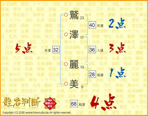 鷲澤麗美さんの総運は68画の4点!