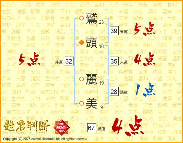 鷲(23画)頭(16画) 麗(19画)美(9画)