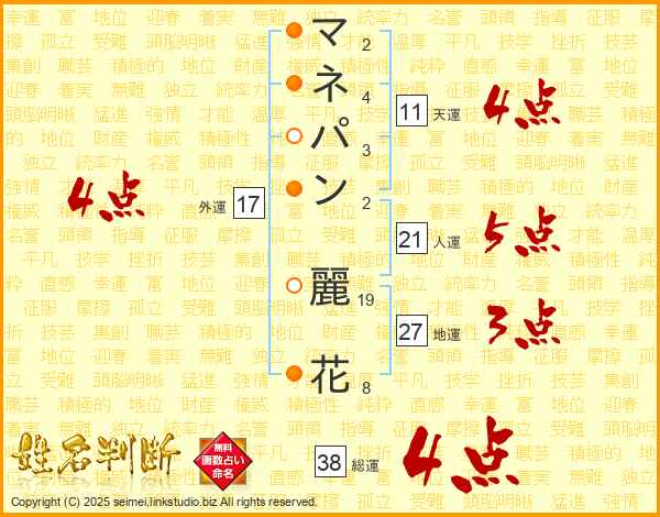 マ(2画)ネ(4画)パ(3画)ン(2画) 麗(19画)花(8画)