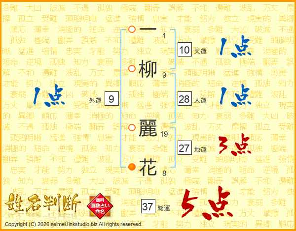 生活面を象徴する運勢です。外部から受ける影響力を表し、結婚運、家庭運や職場、環境への順応性を表します。総運から人運を引いた画数。姓や名が1文字の場合を除く。