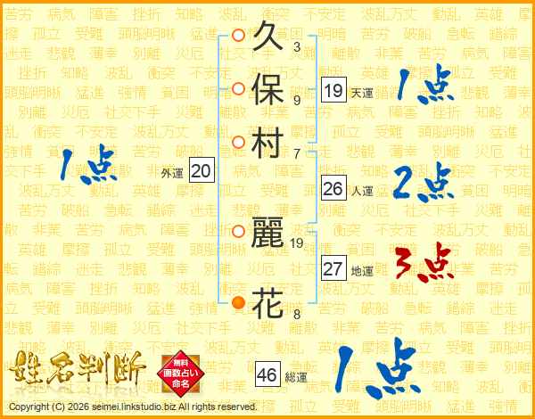 久(3画)保(9画)村(7画) 麗(19画)花(8画)